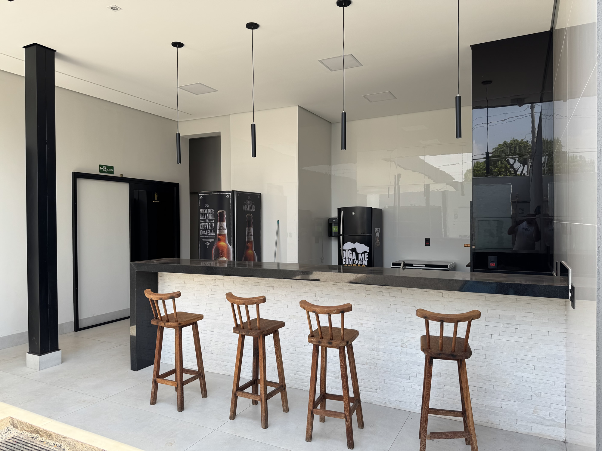- Churrasqueira equipada com balcão, geladeira e cervejeira.