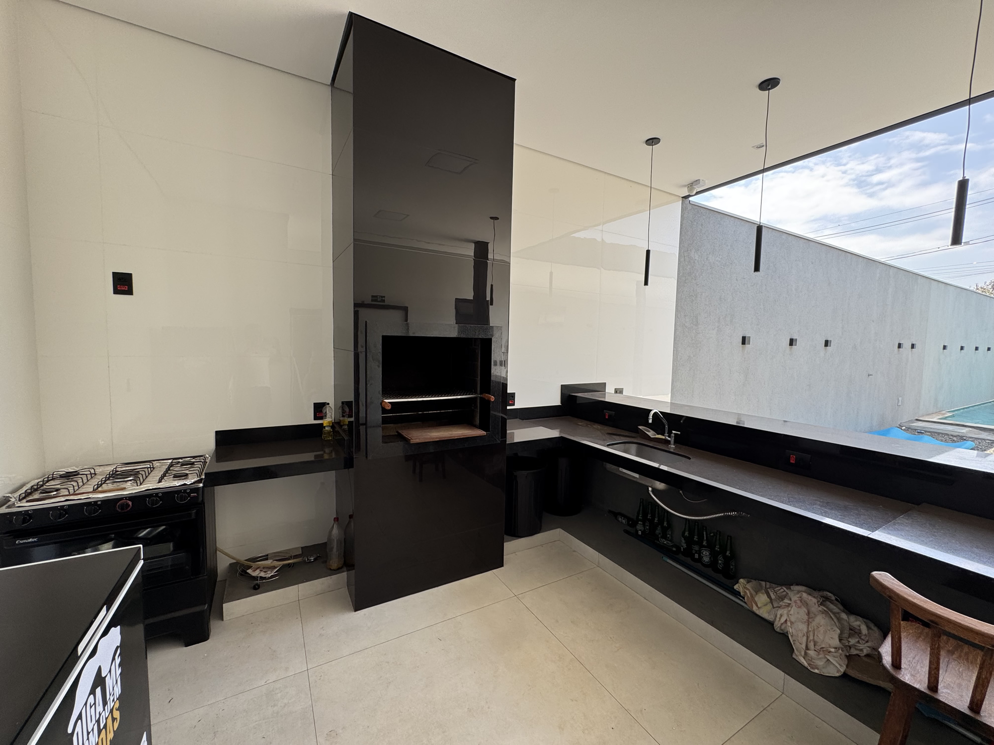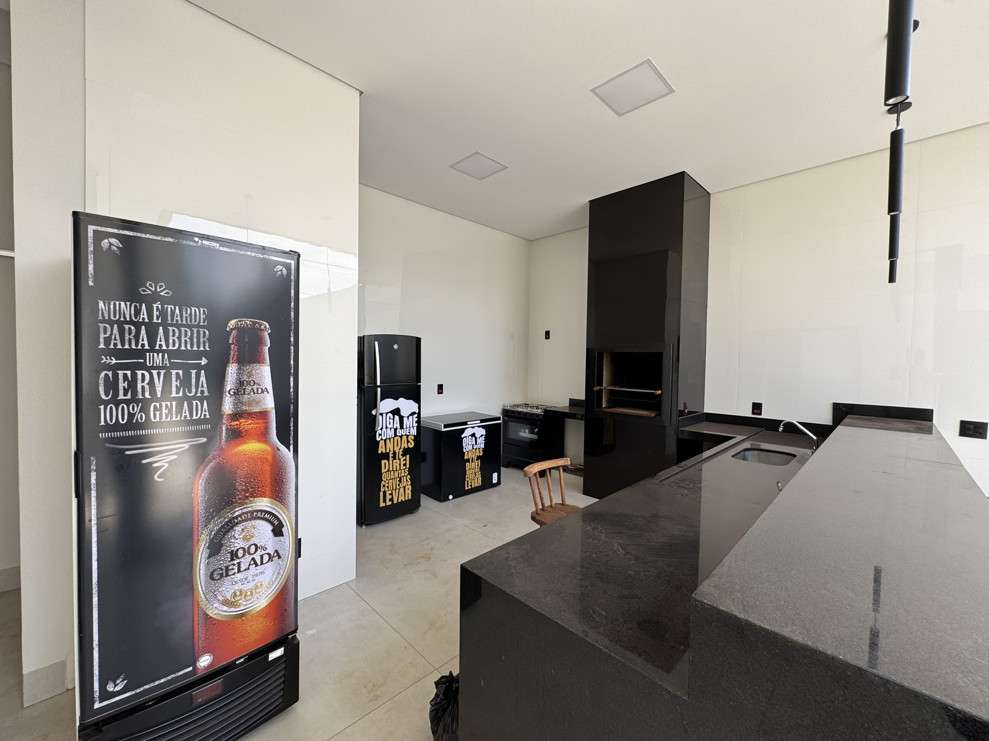 - Churrasqueira equipada com balcão, geladeira e cervejeira.